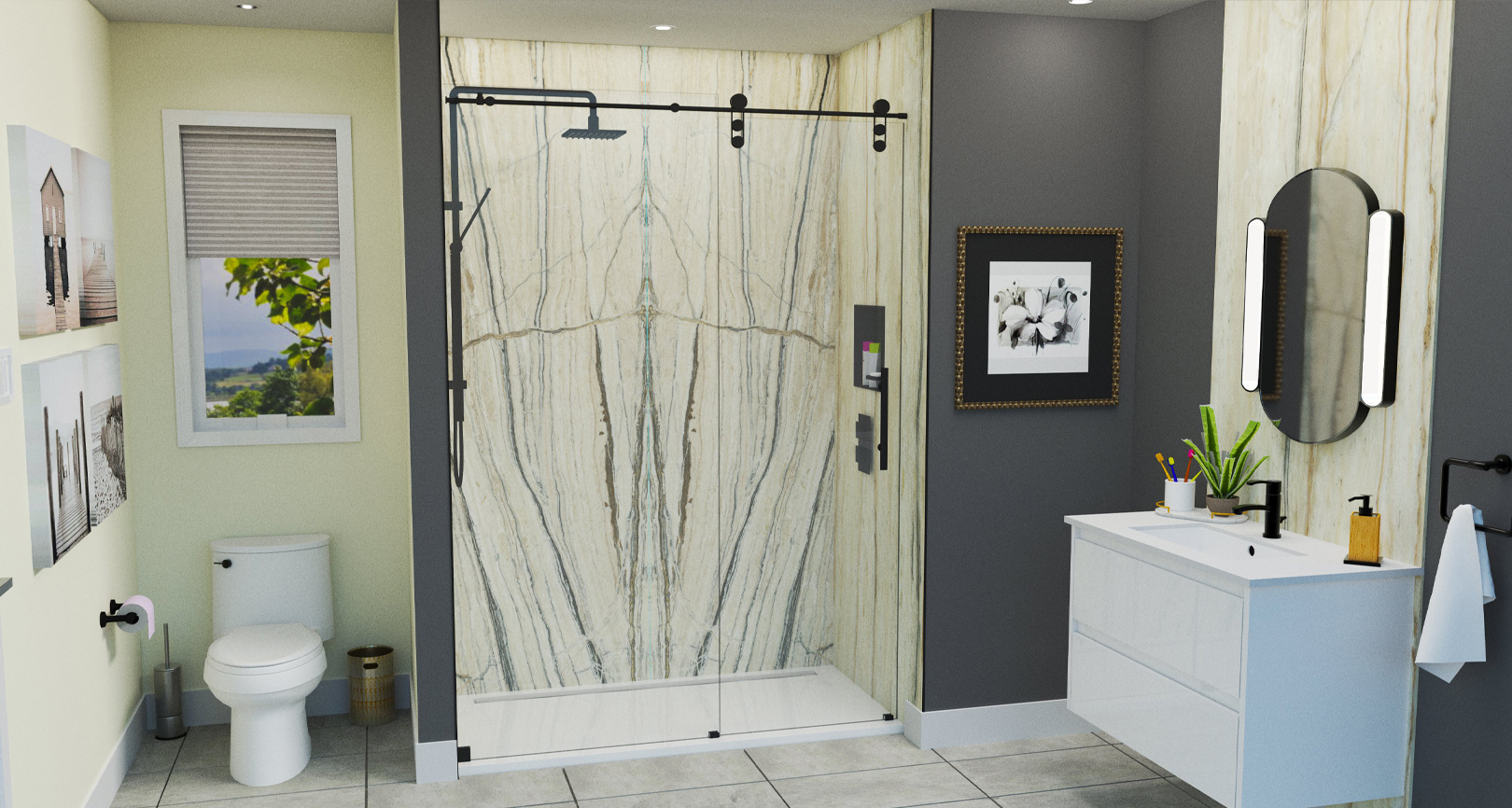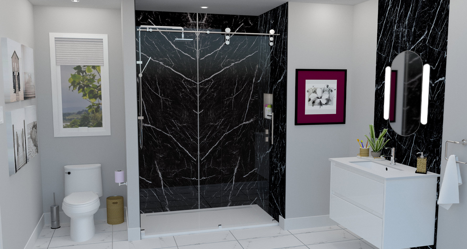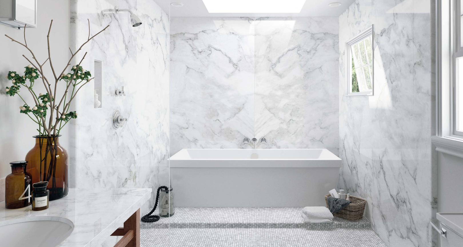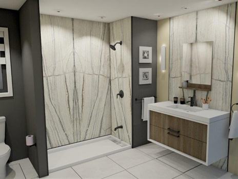 Each individual design pattern is 3-D scanned from real marble or stone with 5 different variations. The panels are digitally printed and then sealed with a UV coating to protect against fading. Each pattern is available in a Matte or Gloss finish. Panels come 49 in x 96 in or can be custom ordered to any smaller size. They are easily installed and cut using a skill saw with aluminum cutting blade for the Do-It-Yourselfer or any tile installer will have no problem. The panels can be installed with construction adhesive right over the existing wall covering and can be grouted just like tile.