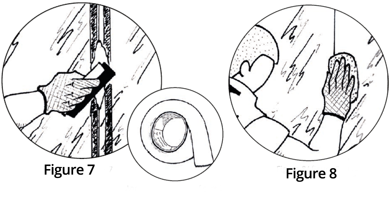 Once all the panels have been installed, you will place masking tape along the vertical edges of the panels, butting up to the space where the grout will go. This will help reduce the extra grout you have to sponge off by allowing you to simply peel the tape off later. After taping, apply the grout to the seams using a rubber trowel. (figure 7)